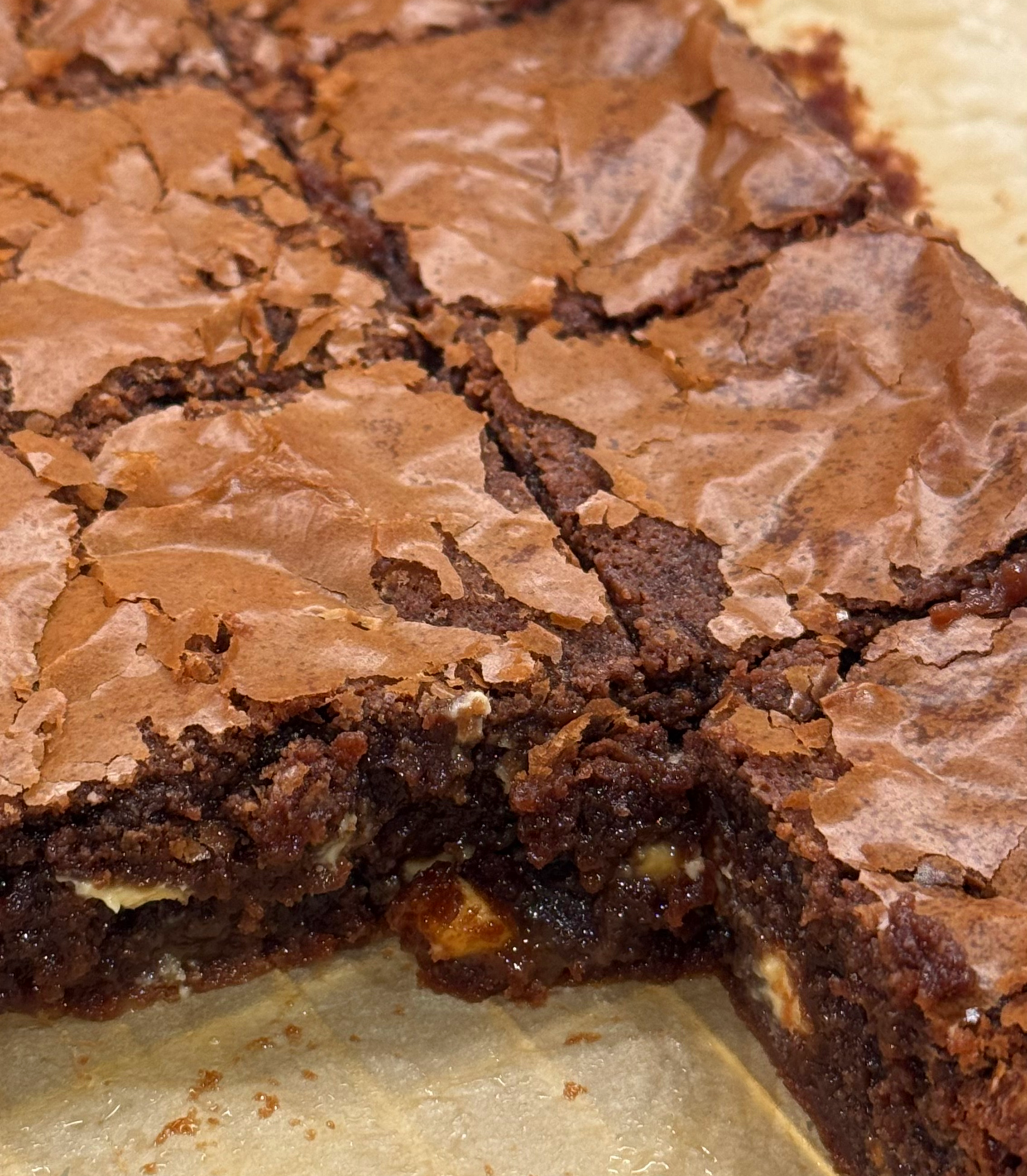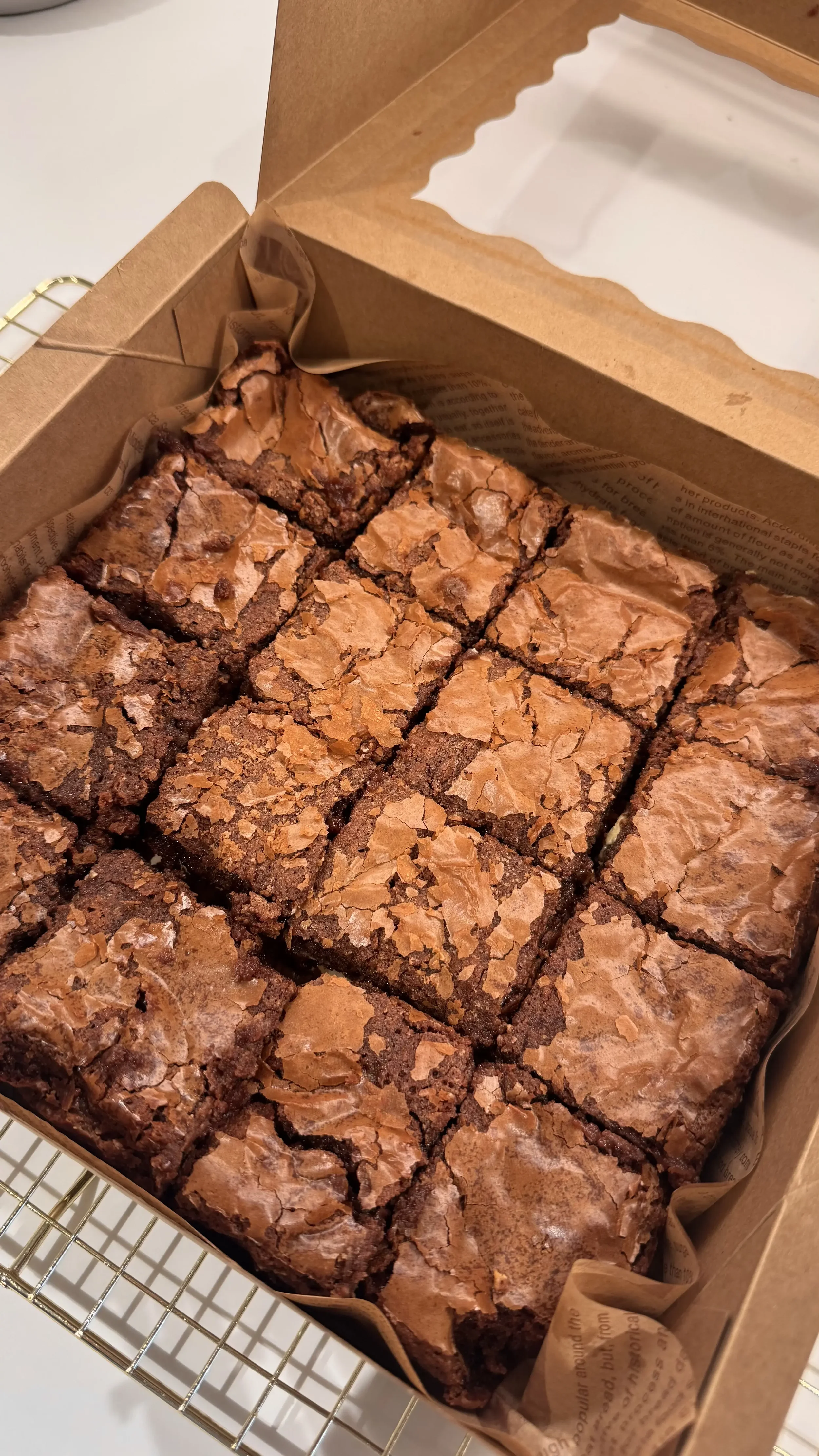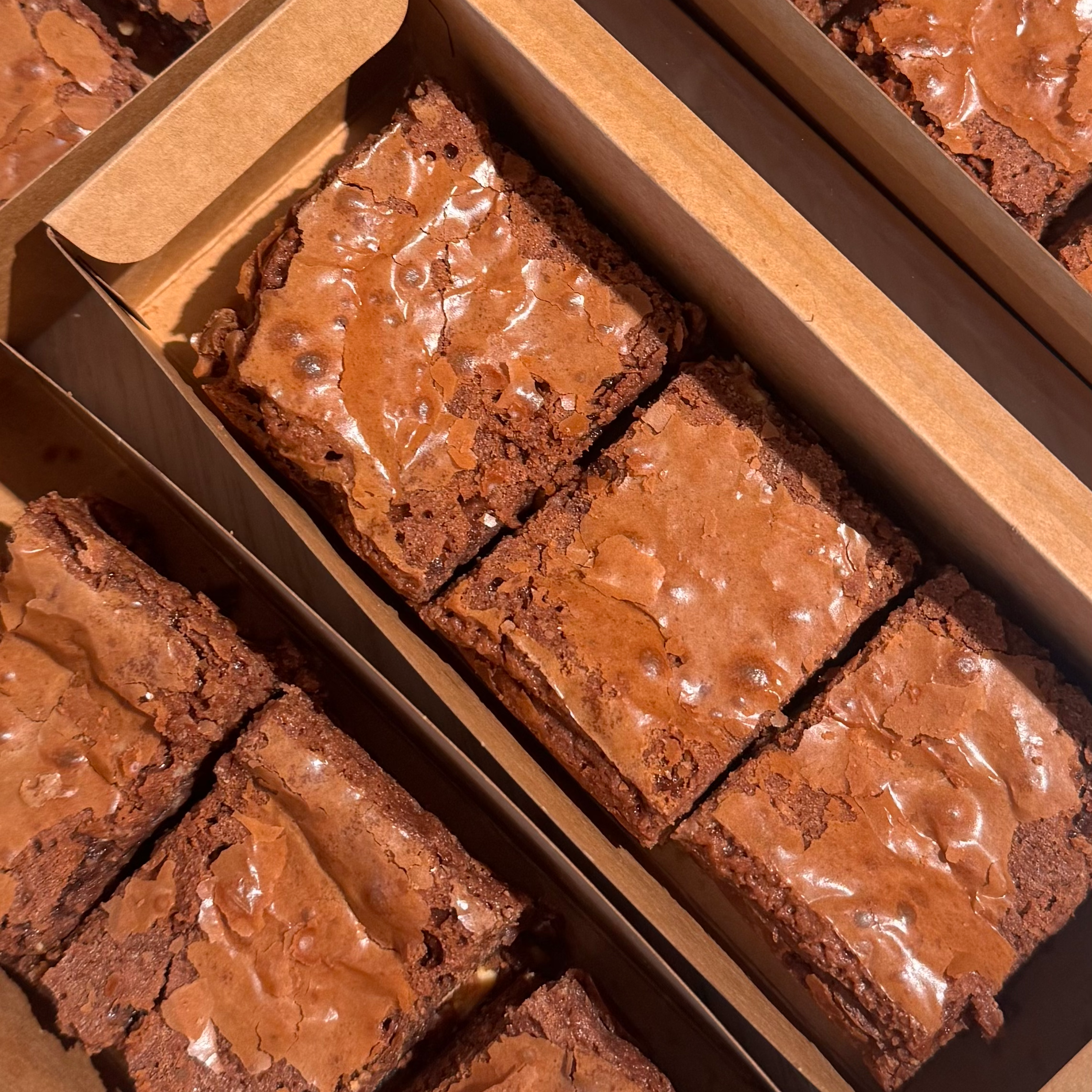 Our brownies are intentionally soft, ultra-gooey, and finished with flaky, crackly tops. This makes them especially delicate and best handled with care.